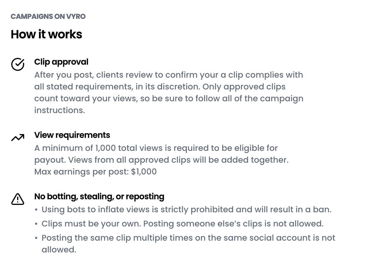 Campaign-based structure: Creators and brands post "campaigns" on Vyro specifying what types of clips they want. Clippers browse these campaigns, create content that fits the requirements, and submit their clips for approval and tracking.
