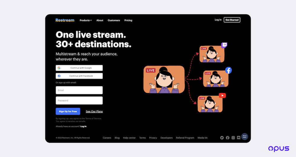 Restream, founded in 2015, is most widely known in the market for its multistreaming capabilities. Through Restream, users have over 30 different multistream destinations to choose from. Aside from their multistreaming features, Restream also has a studio product and an “Upload and Stream” feature for livestream-releasing pre-recorded video.