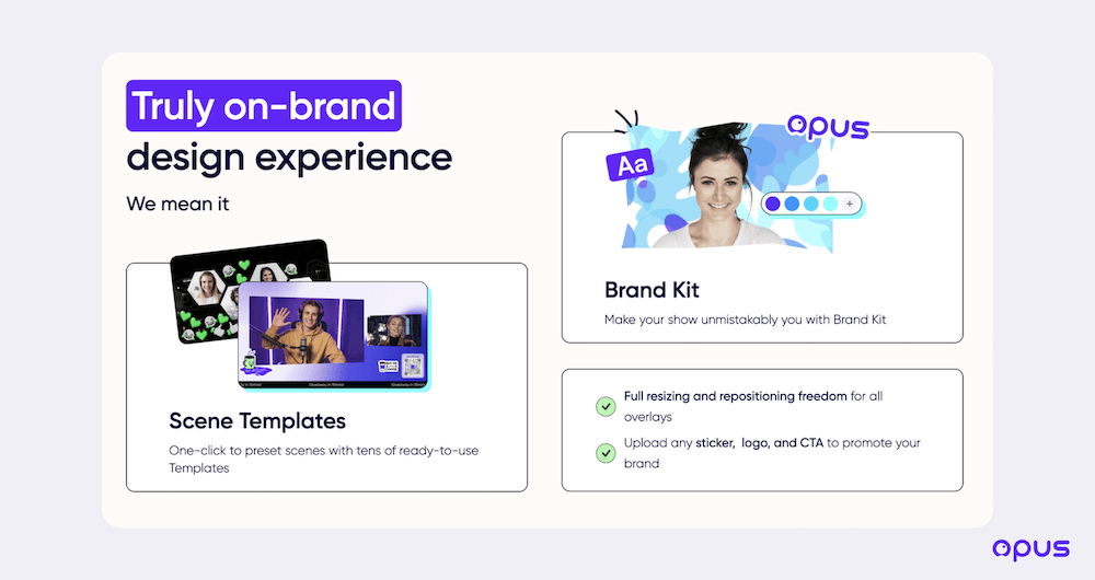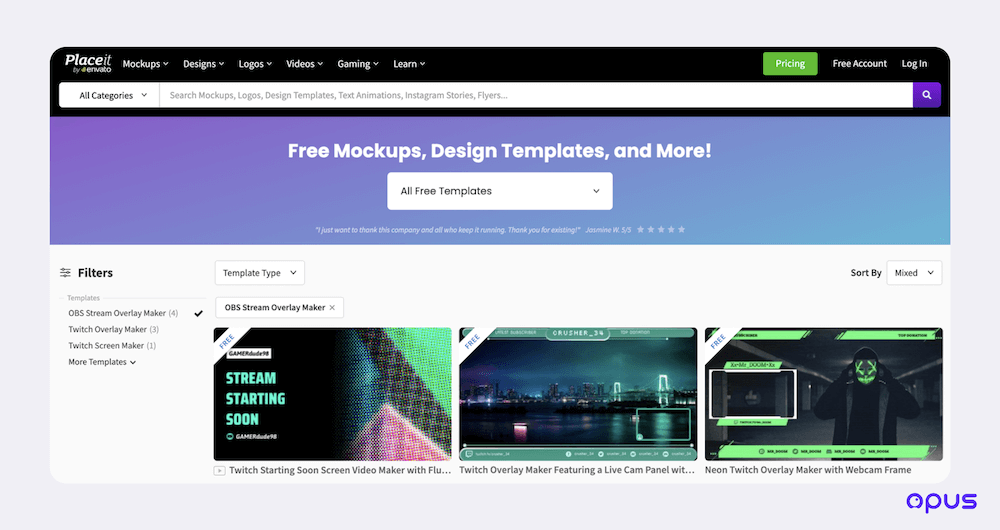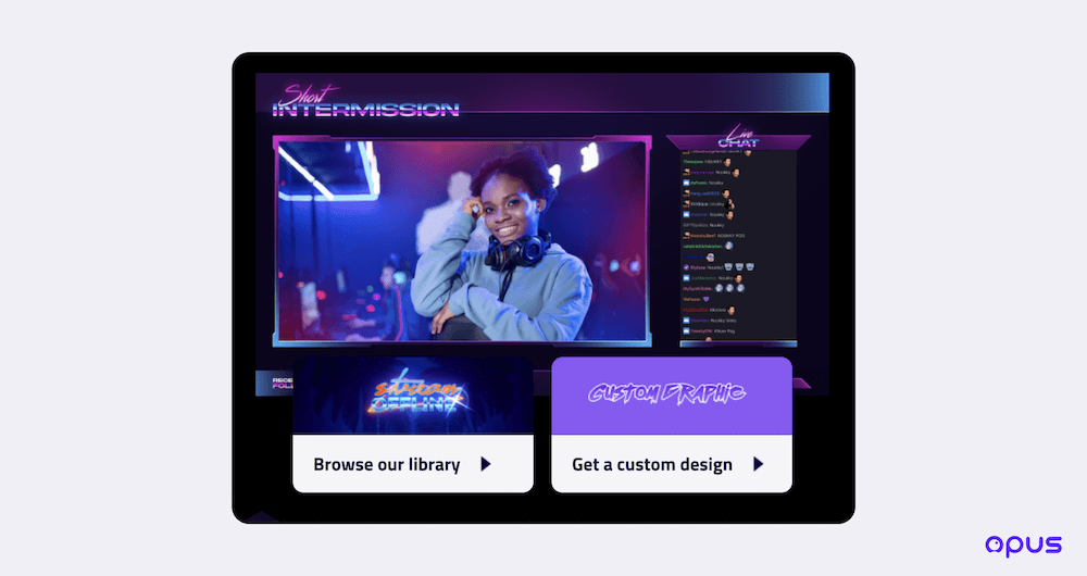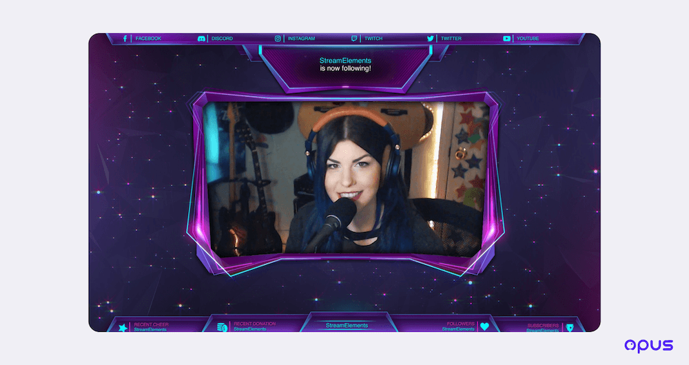 Creating stream overlays with the right size can be time-consuming. Luckily, with some web-based live streaming tools such as Opus, you don't have to worry about this, as they provide a lot of ready-to-use overlays that can add flair to your show.