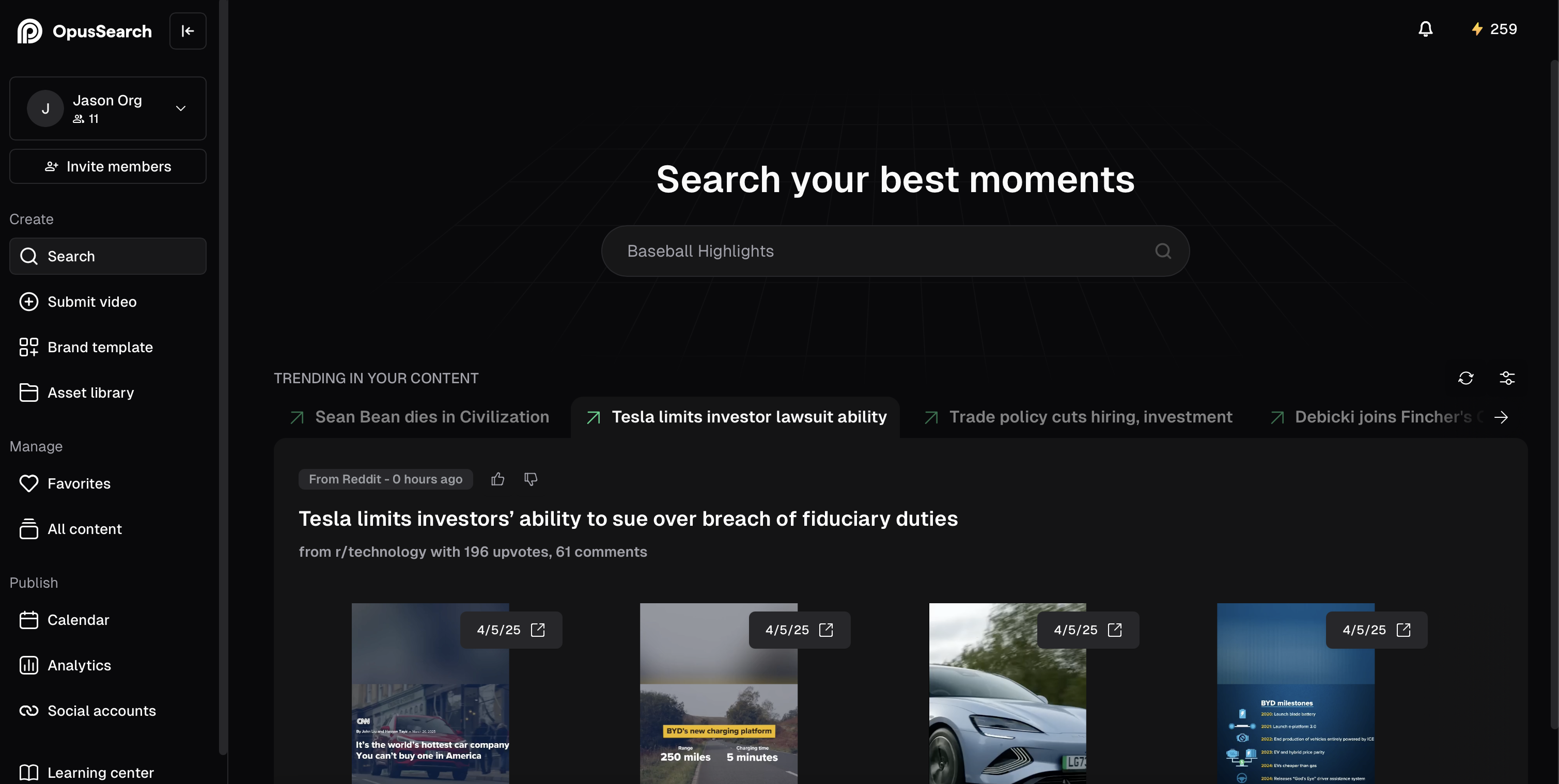 - Auto-search relevant videos: OpusSearch instantly searches your entire video archive for relevant, social-ready clips that aligned with trending topics on X