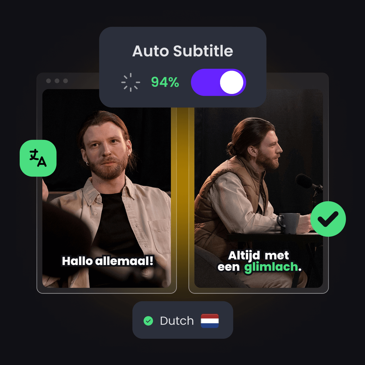 Es la forma más rápida de dar a tus videos un toque neerlandés. Después de subir el video y seleccionar el idioma de los subtítulos, la IA los genera por ti. Subtítulos perfectamente sincronizados y nítidos que impulsan la interacción sin complicaciones. Nada de idas y vueltas. Nada de dolores de cabeza al sincronizar. No tendrás que preocuparte de que los espectadores neerlandeses se pierdan el hilo. Ya sea que crees TikToks, videos de YouTube o anuncios de marketing, los subtítulos con IA garantizan que tu mensaje llegue alto y claro. ¿Para qué perder tiempo si la IA de OpusClip puede añadir subtítulos en neerlandés a tu video en segundos?