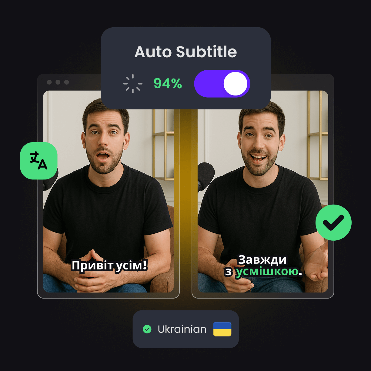 Los subtítulos hacen que tus videos sean más accesibles, atractivos y globales. Pero añadirlos manualmente es una tarea lenta y agotadora. ¿Quién tiene paciencia para transcribir cada palabra, sincronizarla a la perfección y revisar todos los errores? Con OpusClip, no hace falta. Agrega subtítulos en ucraniano al instante con la precisión de la IA. Solo sube tu video y nuestra herramienta generará subtítulos en ucraniano precisos y sincronizados en segundos. Sin escribir. Sin sincronizaciones tediosas. Sin estrés. Llega a millones de hablantes de ucraniano sin esfuerzo. Contenido educativo, videos de marketing o entretenimiento: todo listo para que tu mensaje quede cristalino.