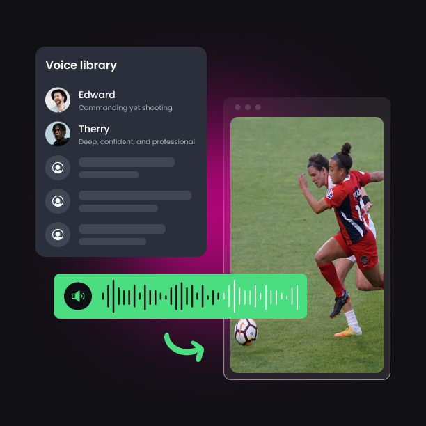 Llega con un guion listo para tu voz en off o deja que nuestra IA lo cree por ti con un clic. Luego elige entre más de 20 voces para tu voz en off.