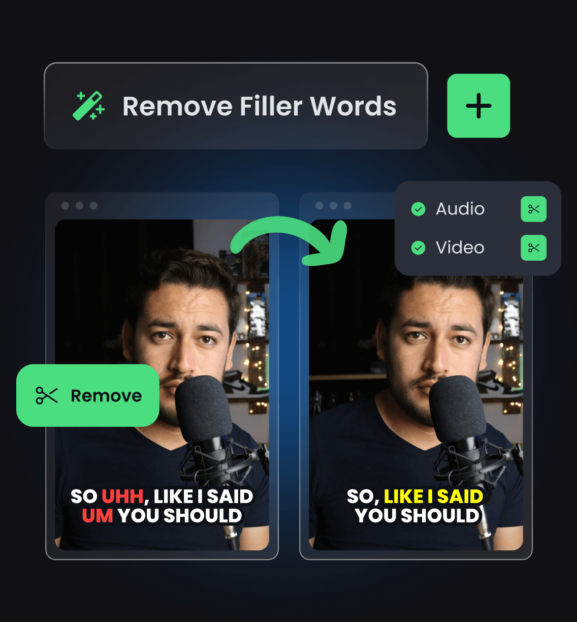 “Eh”, “em”, “como”... Estas palabras se cuelan en tu discurso, llenan de ruido tu mensaje y hacen que tu video suene poco pulido. Ya sea que estés explicando, vendiendo o contando una historia, las muletillas te hacen sonar menos seguro y, seamos honestos, tu audiencia se da cuenta. Por eso necesitas la edición con IA de OpusClip. Igual que nuestra función “Eliminar pausas”, esta herramienta detecta y elimina muletillas de forma fluida. Ya sabes, esos molestos “eh”, “em” y “ya sabes”. Desaparecen tanto del audio como del video. No tendrás que pelearte con la línea de tiempo ni hacer cortes torpes. Obtienes un audio limpio y natural que fluye, tan fácil como dar clic en reproducir.