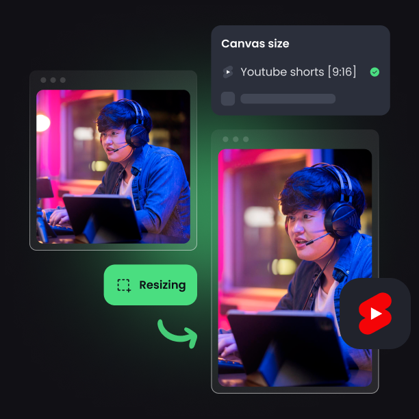 Nuestra IA encaja en tu flujo como el editor más aplicado y cargado de cafeína, pero sin preguntas ni pausas. Se encarga del trabajo tedioso de redimensionar, recortar y centrar la acción, para que nada importante quede fuera del cuadro. Las caras se mantienen intactas, la acción bien enfocada y cada detalle brilla, sin importar el formato. ¿Y tú qué harás con todo ese tiempo extra? En lugar de pelearte con relaciones de aspecto, estarás pensando tu próximo video viral, probando ideas nuevas o simplemente descansando sabiendo que tu contenido está listo para Shorts de YouTube. Pasa menos tiempo redimensionando y más tiempo creando.