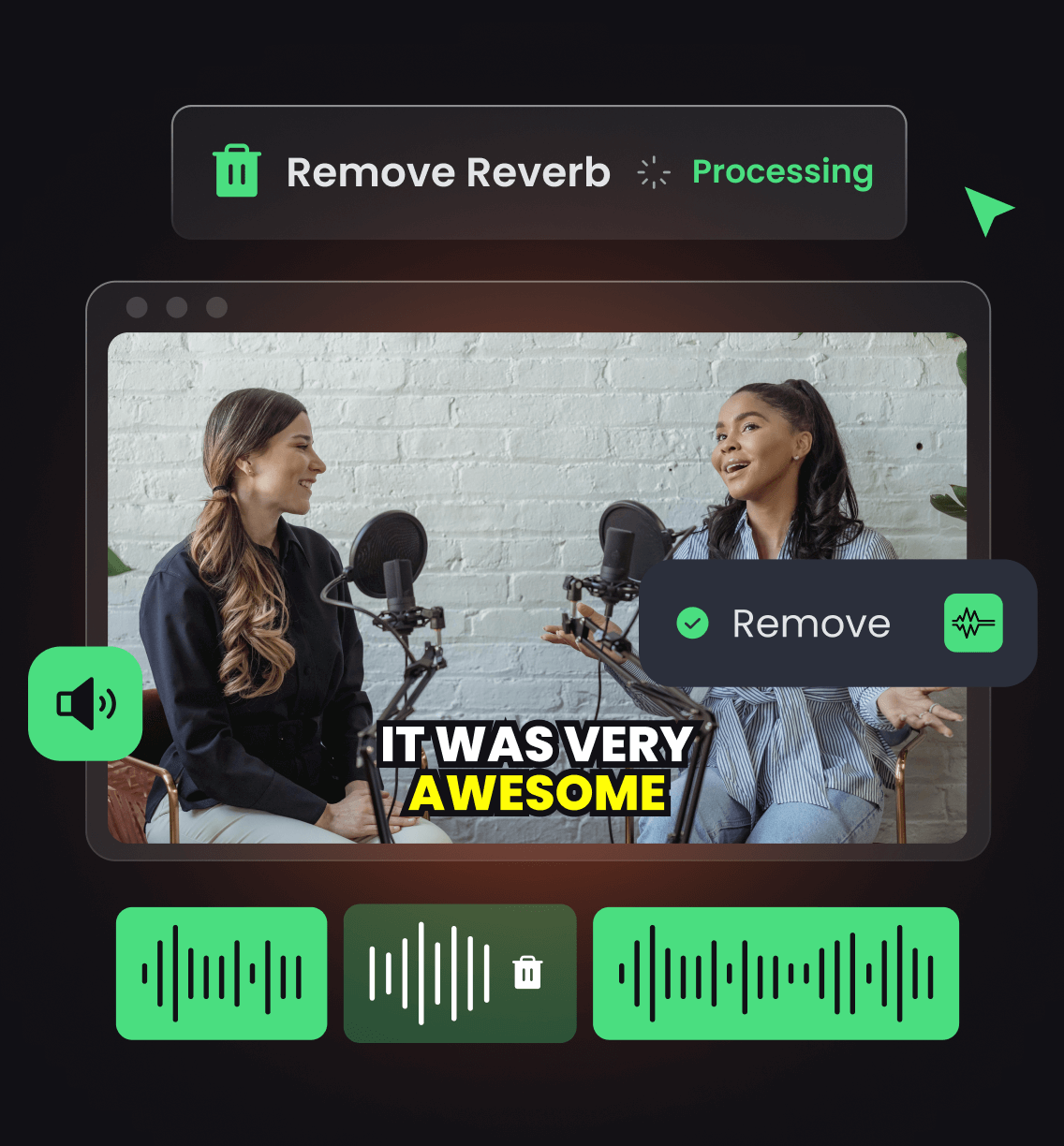 Arregla tu audio en segundos, no en horas. Nuestra IA limpia rápidamente la reverberación para que puedas concentrarte en crear contenido.