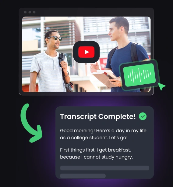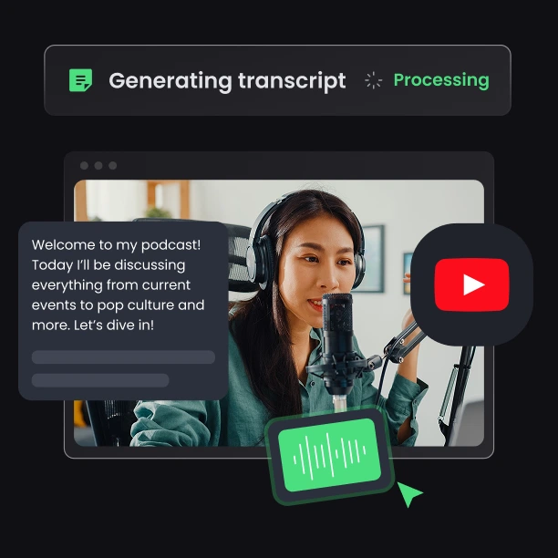 Obtener una transcripción de un vídeo de YouTube nunca ha sido tan fácil. Simplemente pega tu enlace de YouTube en el generador de transcripciones de vídeos de YouTube y nuestra IA extrae al instante cada palabra pronunciada en el vídeo. No se requieren conocimientos técnicos, simplemente copie, pegue y descargue su transcripción.