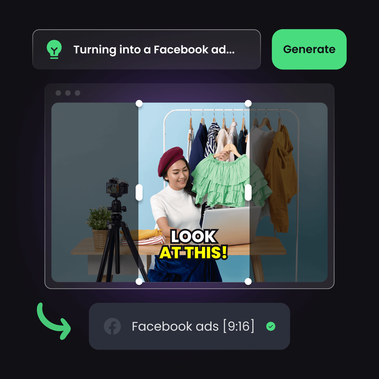 Esse é o objetivo! A OpusClip garante que todo anúncio esteja no formato vertical do Facebook.