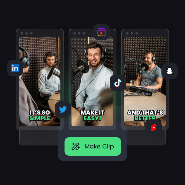 Nosso criador de clipes permite transformar episódios longos em vários clipes concisos e atraentes, fáceis de assimilar pela sua audiência. A IA identifica segmentos com alto potencial de viralização. Com apenas um clique, você produz vídeos de alta qualidade e compartilháveis, sem precisar saber editar. Nosso painel evita que você passe horas procurando bons momentos: fazemos o trabalho pesado e você só escolhe seus favoritos.