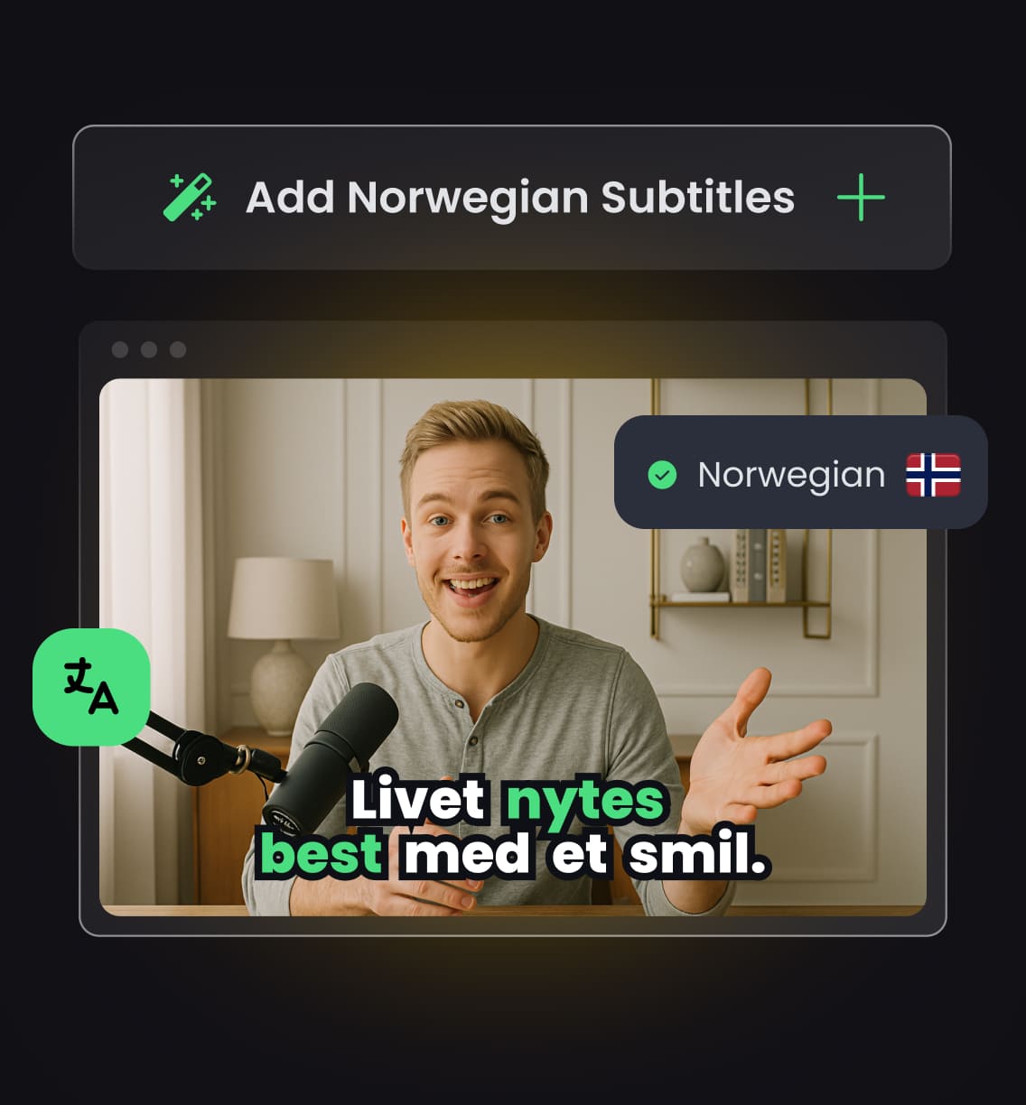 Generate accurate Norwegian translations of your English captions in seconds. No manual typing, no back-and-forth with translators—just upload and translate.