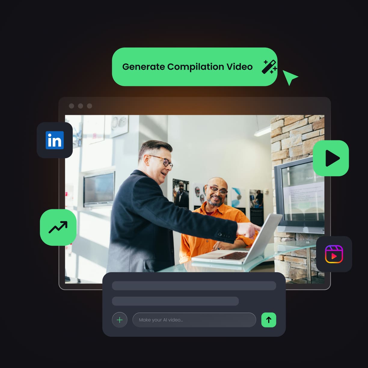 Export your finished compilation in multiple aspect ratios and formats, ready to publish on TikTok, Reels, YouTube, LinkedIn, and beyond.
